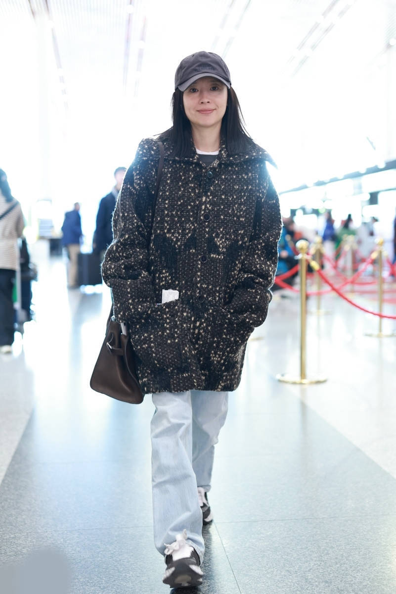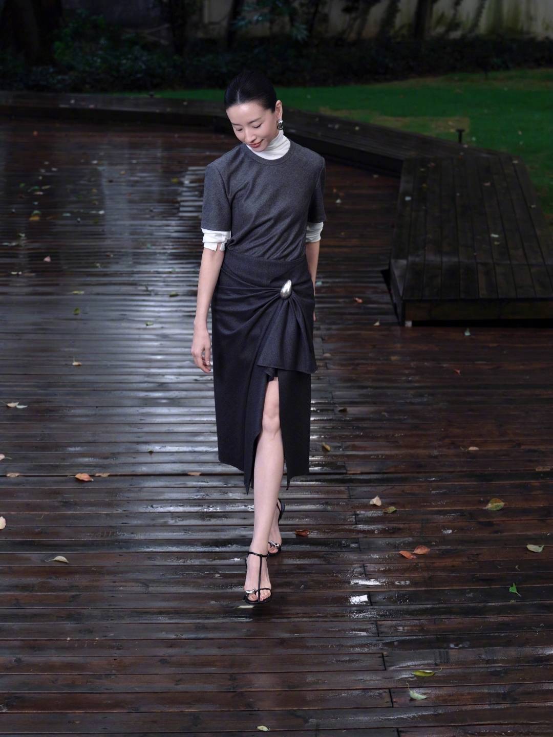 第一个要划重点的,是她对颜色的克制。去年秋冬爆火的“美拉德风”,董洁穿的不是那种饱和度过高的焦糖色,而是加了灰度的奶茶棕上衣,配黑色半身裙。这种“上浅下深”的组合,既不会像全黑那样沉闷,又比五颜六色更显气质。她在采访里说过,自己衣柜里80%都是基础色,偶尔用莫兰迪色系提亮,比如雾霾蓝针织衫配米白色阔腿裤,亚洲黄皮穿了直接白两个度。最绝的是她连配饰都统一色调,棕色皮带配同色系包包,视觉上干净得像开了“一键整理”。